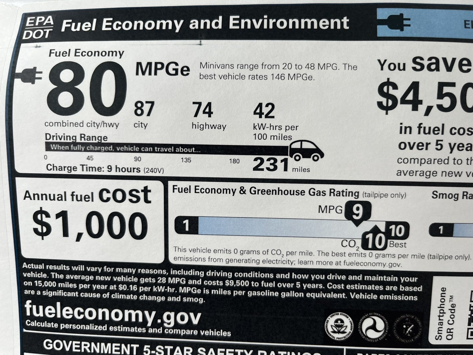 - EPA MPG Equivalent - Combined: 80.0